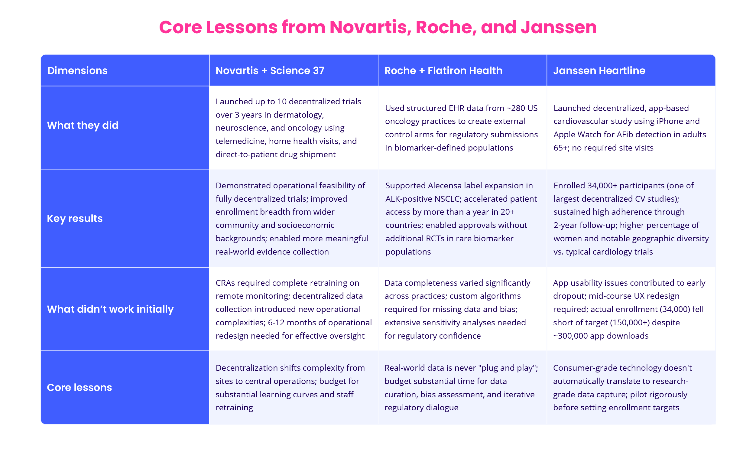 What didn't work initially: CRAs required complete retraining on remote monitoring protocols. Decentralized data collection introduced new operational complexities around protocol compliance and monitoring SOPs that weren't present in site-based trials. The partnership necessitated 6-12 months of operational redesign to establish effective oversight of remotely-collected data.