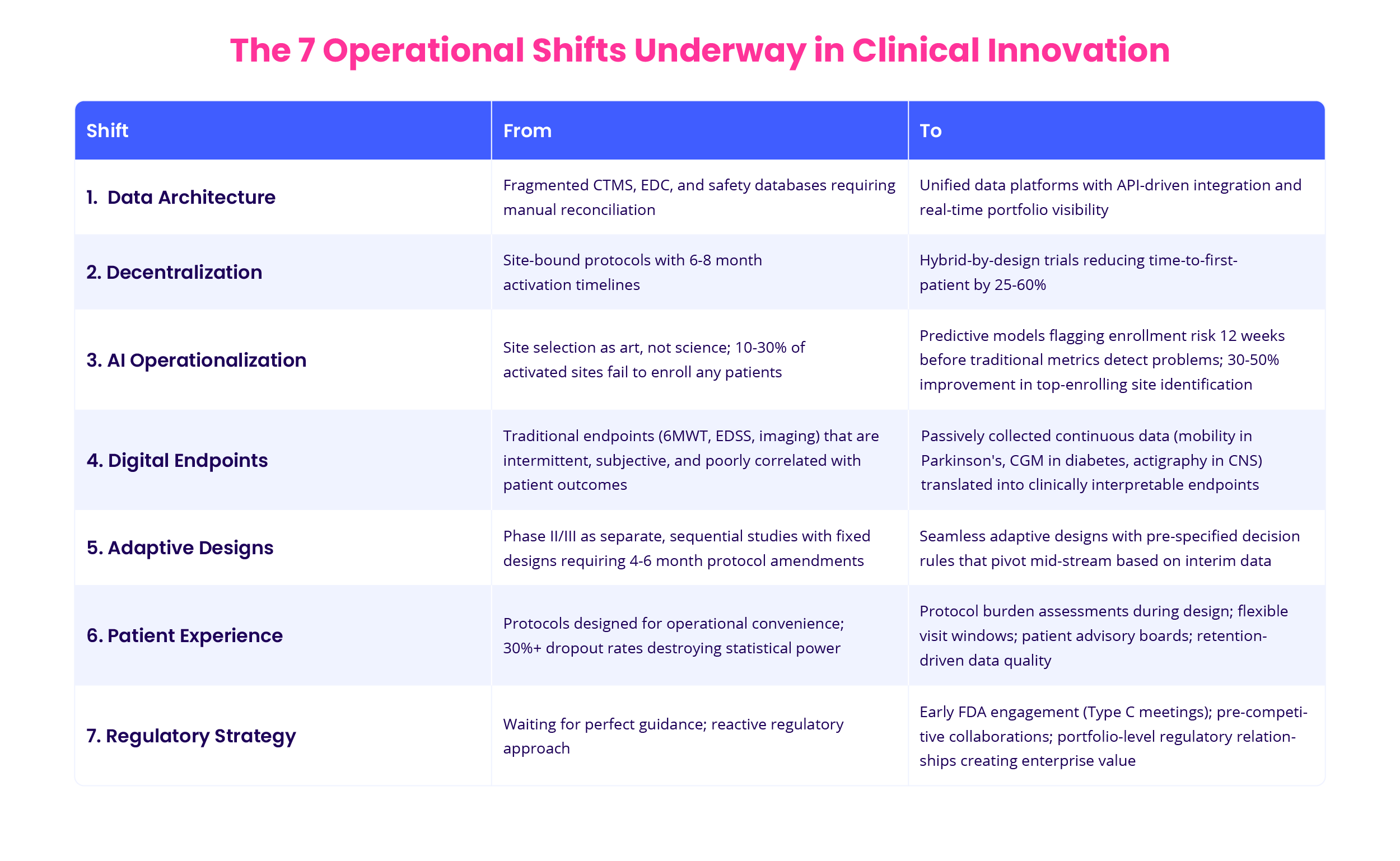 These seven shifts reflect the strategic retooling of how clinical trials and clinical studies are designed, executed, and connected to treatment development. Companies that can't operationalize these shifts within 24 months will face increasing pressure on timelines, costs, and portfolio productivity.