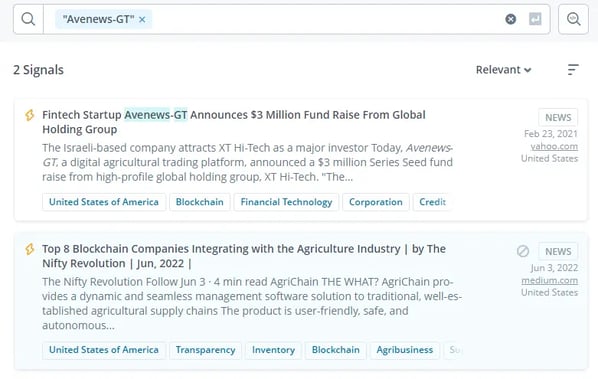 You can gain more insights about the startup by directly searching for it on the Signals page. This gives you highly relevant news solely related to the startup.