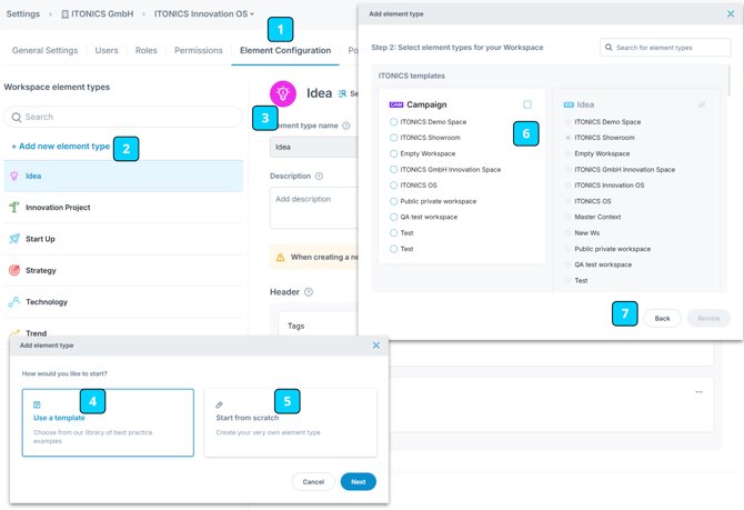When you create a new element type [2], a modal will open. The modal allows you to choose between importing any template from another workspace or activating the ITONICS blueprints for this workspace [4]. You can also choose to start from scratch [5] and create your custom element types.