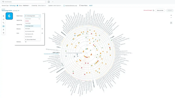 To display content on a radar, you first need to select the right content/element types from the filter selection. Any saved radar view in the left navigation menu thus represents a filtered and saved radar view.