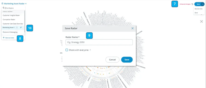 When you click there, a pop-up appears where you are asked to provide a title for this view [9]. Afterward, you can directly save it or if you are a Workspace Admin or Moderator, you will also find the option to "share with everyone". When you share with everyone, every workspace user will find the name of this saved radar view in their menu.
