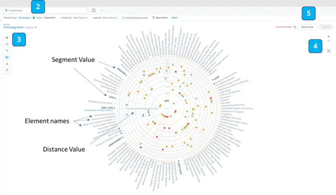 The ITONICS Radar is the tool for displaying a rich content landscape and understanding it easily by representing multiple characteristics visually and simultaneously by the distance to the radar center, placement in a segment, color, halo, and donut.