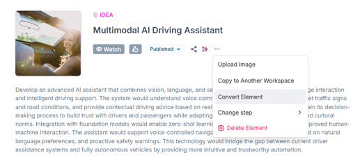 Easily switch the element and content type to correct wrong assignments or progress the innovation funnel from idea to project.