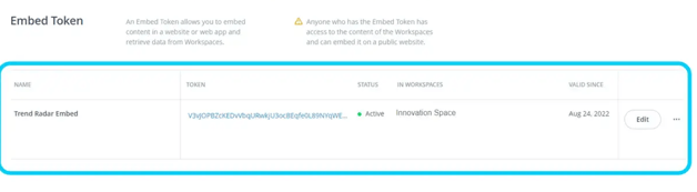 After the creation, a new table will be displayed listing the Embed Token, its name, its validity, to which workspace(s) it belongs, and its status.