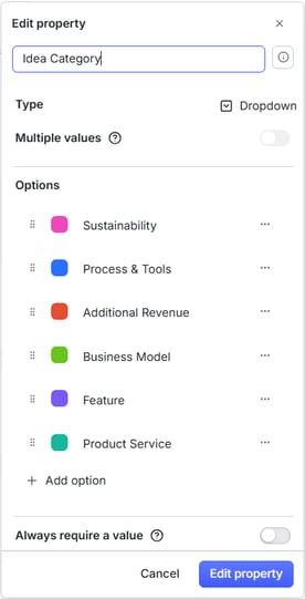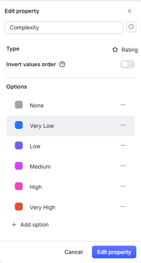 Note: Currently, existing values (e.g., options in dropdown or rating properties) cannot be deleted to avoid data loss. If certain values are no longer needed, we recommend creating a new property with the required, updated options instead.