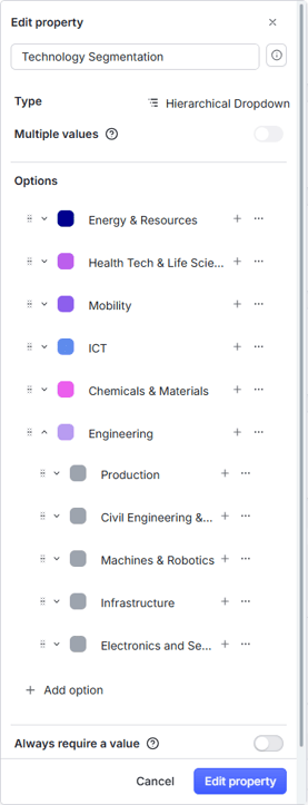 The hierarchical dropdown property type is perfect for segmenting elements for display on Radars views.