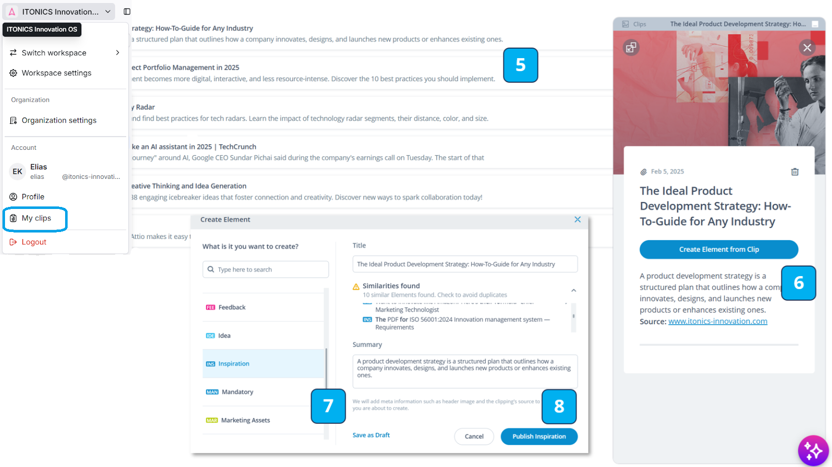 From here, you can delete the clipping via the trash icon or share it with your colleagues by clicking "Create element from clip" [6]. The clip will now be copied into any of your element types within the workspace you are currently signed in. Via the modal, you can select the element type [7], and once happy publish it [8].