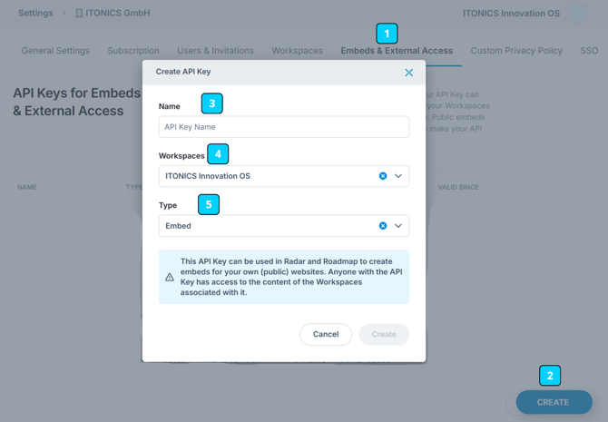 B. In the next menu, you will find the "Embeds & External Access" tab [1] and a "Create" button [2]. Click on the Create button to add an Embed Token. In the menu, select the workspace(s) from which you allow the workspace owners to embed (the one containing the radar), a descriptive name and type "Embed".