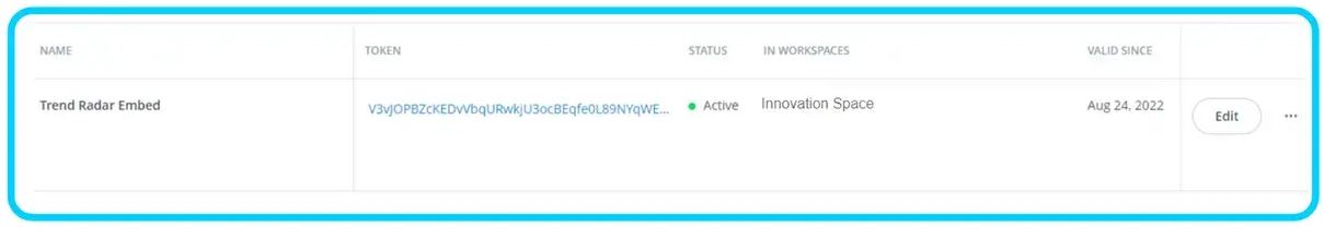 After the creation, a new table will be displayed listing the Embed Token, its name, its validity, to which workspace(s) it belongs, and its status.