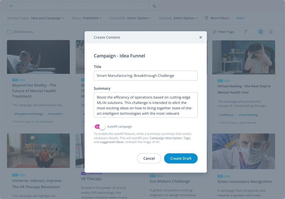 With the power of GenAI at your disposal, you can now swiftly generate ideation campaigns and individual ideas guided by a range of prompts that accelerate the generation of descriptions with lightning speed. This saves invaluable time and enhances the quality of ideas submitted. Imagine evaluating incoming ideas in the blink of an eye, streamlining the initial identification process based on precise AI-generated assessments.