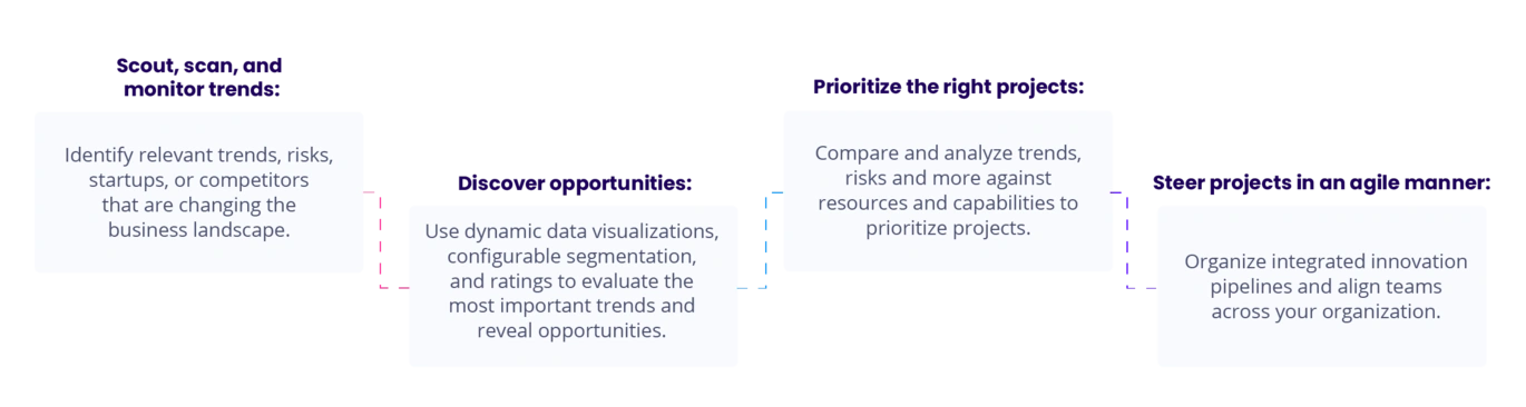 Reduce the human effort required to spot and monitor important trends with filtered data that fit your search intent. Save time by allowing distributed teams to scout trends within one online platform and build cross-functional innovation ecosystems. Identify trends, risks, and startups that have potential—short, mid, and long term.
